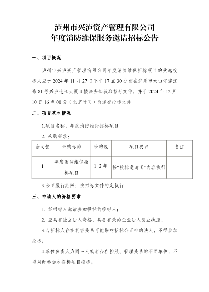瀘州市興瀘資產管理有限公司年度消防維保服務邀請招標公告