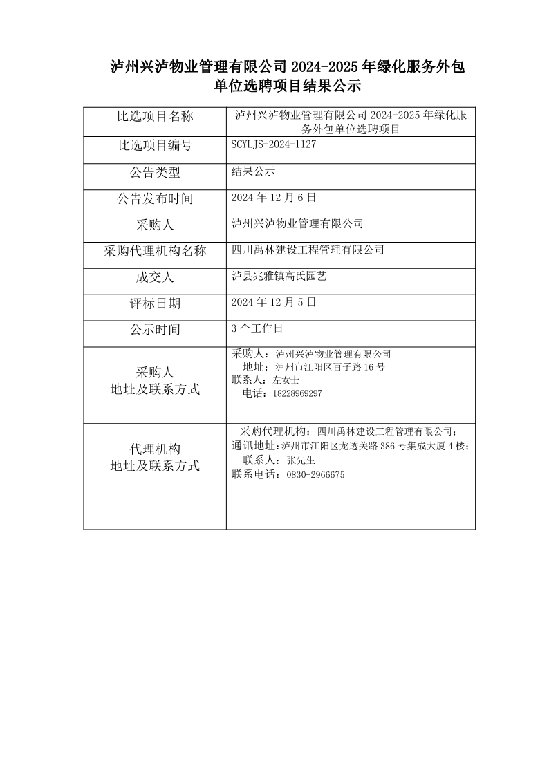 瀘州興瀘物業管理有限公司2024-2025年綠化服務外包單位選聘項目結果公示