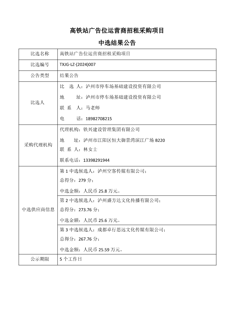 高鐵站廣告位運營商招租采購項目中選結果公告