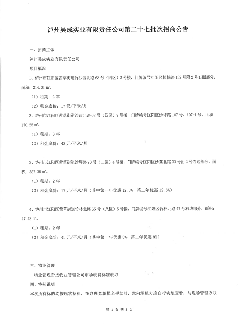 瀘州昊成實業有限責任公司第二十七批次招商公告